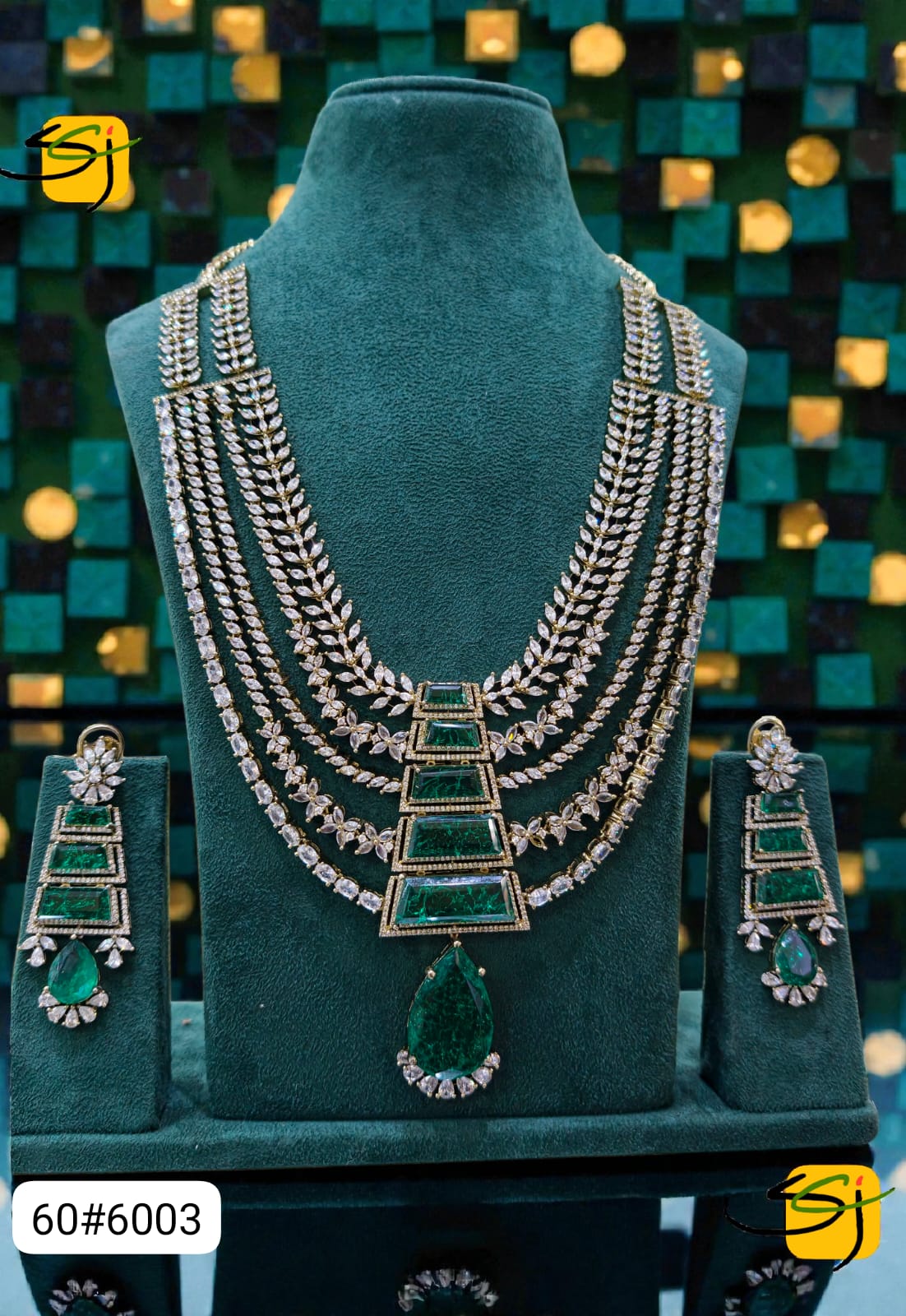 Exquisite multi-strand necklace set featuring stunning emerald green stones with sparkling crystal embellishments. This luxurious piece showcases multiple strands of crystals and emerald accents, creating a cascading effect with a beautiful emerald teardrop pendant.